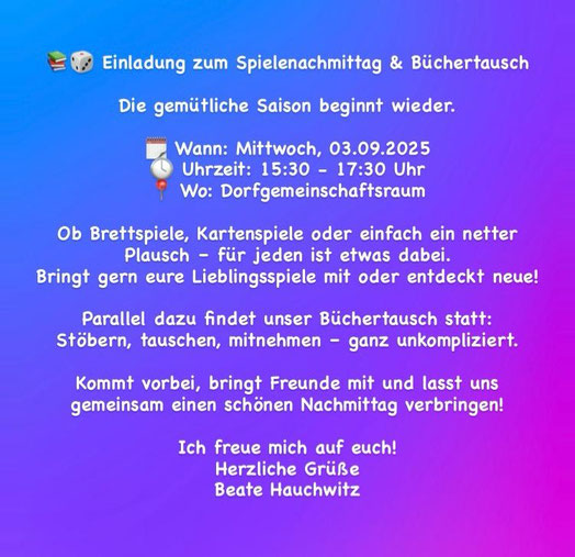 ich möchte euch nochmal an die Unterzeichnung des Infoschreibens zum Thema Breitbandausbau in Zülichendorf bis zum 27.04.2025 erinnern.