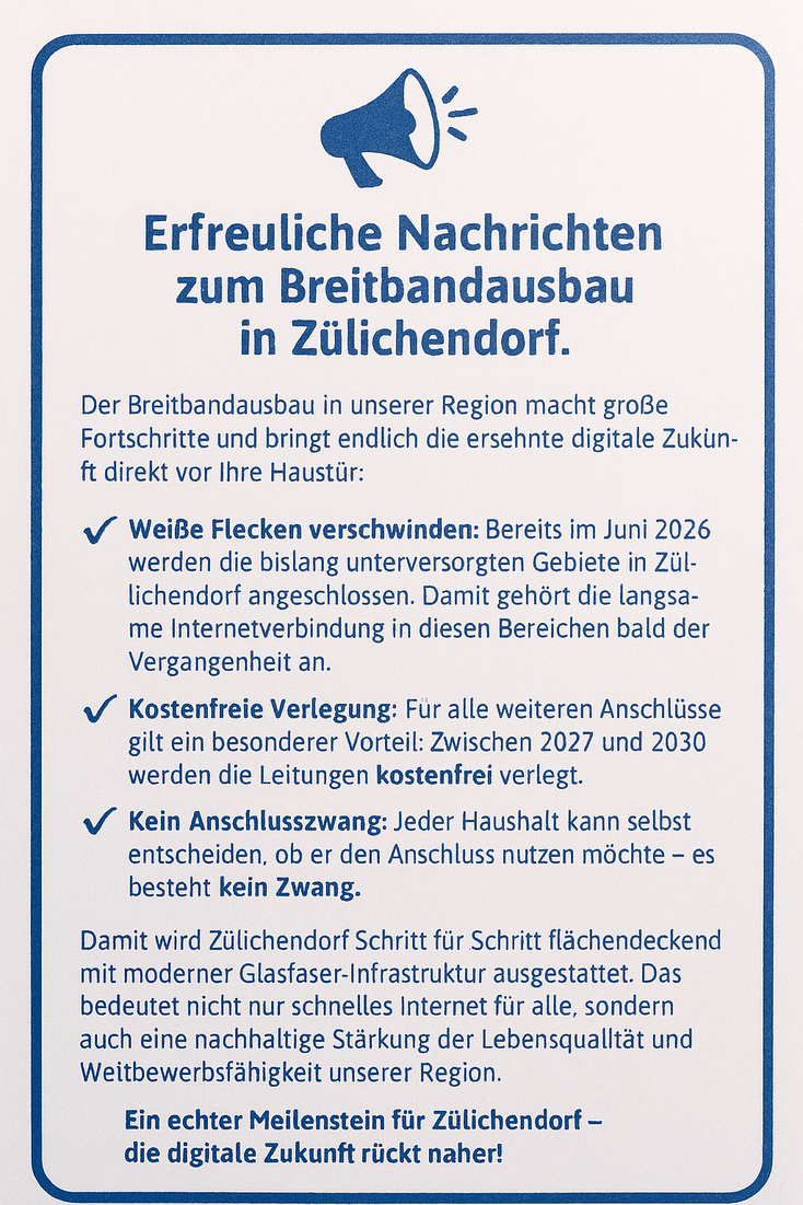 Der Breitbandausbau in Zülichendorf ist nicht nur ein technisches Projekt, sondern ein entscheidender Faktor für die zukünftige Entwicklung und den Wohlstand unseres Ortes. Schnelles Internet ist im 21. Jahrhundert eine Grundvoraussetzung für nahezu alle Lebensbereiche und beeinflusst maßgeblich die Attraktivität des Ortes.