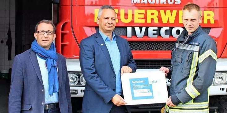 Heiko Nimpsch (M.) übergab den 1000 Euro-Scheck an Gemeindebrandmeister Mathias Richter (r.) und Bürgermeister Stefan Scheddin (l.). Quelle: Privat