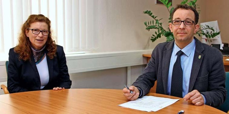 Stefan Scheddin unterzeichnet im Beisein von Jovita Galster-Döring die Erklärung. Quelle: Gemeindeverwaltung Nuthe-Urstromtal
