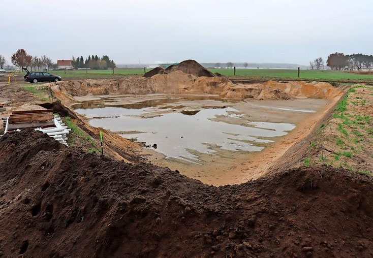 Das erste von zwei Versickerungsbecken ist im Bau. Quelle: Iris Krüger