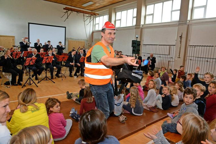 Zülichendorf. Mit Pauken und Trompeten begeisterte das große Landespolizeiorchester Brandenburg am Mittwochvormittag die Schüler der Grundschule "Am Pekenberg" in Zülichendorf. Sie verwandelten die Turnhalle in einen riesigen klingenden Unterrichtsraum. Den Auftakt macht das Programm "Ein ganz normaler Tag" für die Kita-Kinder und die 1. bis 3. Klassen. Thomas Petersdorf vom Landespolizeiorchester schlüpfte in die Rolle des fünfjährigen Christian, der allein in den Kindergarten gehen muss. Auf dem Weg dorthin passiert so einiges und die Kinder erfahren, wie sich sich an Ampeln verhalten sollen und dass sie nicht mit Fremden mitgehen dürfen.