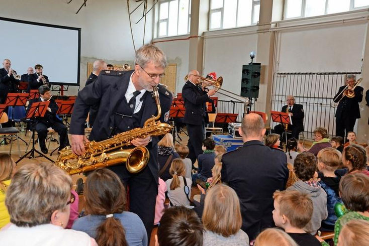 „Er war Schüler unserer Schule und spielt jetzt im Polizeiorchester", teilte die Schulleiterin nicht ohne Stolz mit. Neben Jörg Dorneburg ist mit Andreas Jähmlich ein weiterer "Lokalmatador" im Landespolizeiorchester dabei.