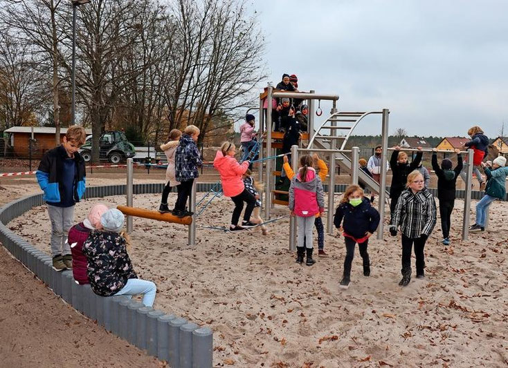 Schon stürmten am Montag sämtliche Kinder der ersten bis sechsten Klassen zu den verlockenden Spielmöglichkeiten, die ihnen ab sofort zur Verfügung stehen. Nach nur wenigen Monaten Bauzeit ist die Schulhofumgestaltung in Zülichendorf endlich abgeschlossen.