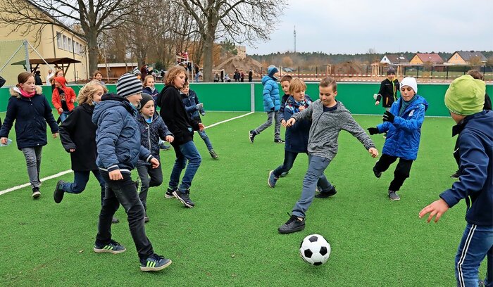 In Zülichendorf wurde der Schulhof der Grundschule umgestaltet. Kids haben jetzt einen neuen Bolzplatz und neue Spielgeräte. Gleich nach der Eröffnung am Montag durfte alles auf Herz und Nieren geprüft werden.