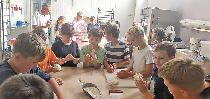 Chia, Leinsamen und Hafer. Hier zeigte ihnen eine Mitarbeiterin aus der Produktentwicklung, wie man Brot und Brötchen „rundwirkt“, so der Fachbegriff für das Kneten des Teigs. Die Kinder waren davon sehr begeistert und durften es selbst versuchen. Dabei kamen viele unterschiedliche Kreationen, wie geflochtene Zöpfe oder Fußballbrötchen,