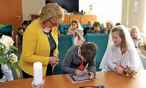 sein, nur echt, eben eine runde Sache wie ein Ei. Bleibt Freunde fürs Leben“, gab der Bürgermeister den Kindern mit auf den Weg. Nach dem obligatorischen Gruppenbild, einem Überraschungsei für jede und dem feierlichen Auszug aus dem Standesamt wartete auf die Erstklässler im Sitzungssaal noch eine Überraschung. Neben Getränken und Obst erhielt jedes Kind ein buntes Osterei. Nebenher erklärte Christiane Heine die Aufgaben der Verwaltung in kindgerechter Weise. Außerdem las sie eine Geschichte vor, die viele Wörter mit „ei“ enthielt. Die Kinder hörten so aufmerksam zu, dass Stefan Scheddin eine Erzählung mit viel Hai und „ei“ quasi als Zugabe zum Besten gab.
