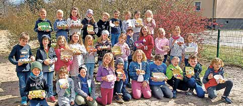 Hortkinder zeigen stolz ihre bunten Ostereier.